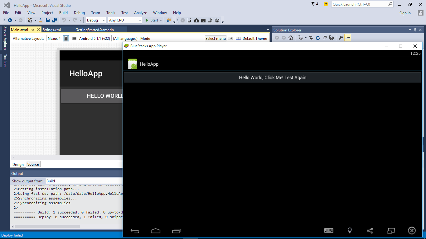 | VS2015 Hello World of Xamarin-Android App run on BlueStacks App Player |