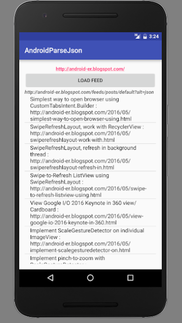 Last post show a example to "Download and parse blogspot JSON feed". In this post, OnItemClickListener is added to the ListView; for user clicking to open the url in browser, using "Simplest way to open browser using CustomTabsIntent.Builder".